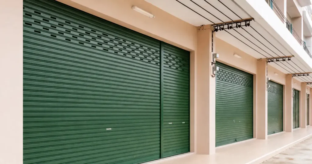 Custom-built commercial roller shutter doors designed for daily use in retail and business environments.